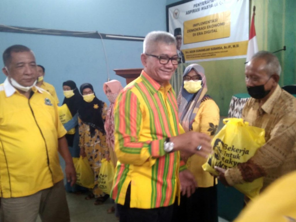 Tribuana News. Kota Banjar - Anggota DPR RI Drs. Agun Gunandjar Sudarsa, Bc.IP, M.Si, dari fraksi Partai Golkar yang didampingi ketua DPD Partai Golkar Kota Banjar Drs H Dadang R Kalyubi, M.Si, menyerahkan bantuan paket sembako saat melakukan kunjungan daerah pemilihan (Kundapil) di Kota Banjar.