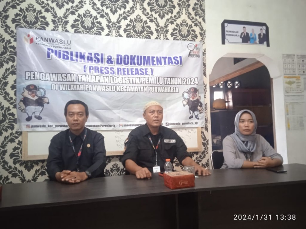 BANJAR, -- Panwaslu Kecamatan Purwharaja dan Panwaslu Kecamatan Pataruman press release pengawasan tahapan logistik Pemilu tahun 2024, Rabu (31/1/2024) bertempat Sekretariat Panwaslu Kecamatan Purwaharja dan Kecamatan Pataruman, Kota Banjar, Jawa Barat.