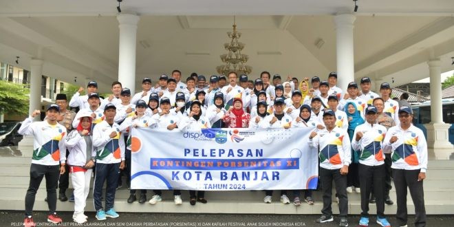 Penjabat Wali Kota Banjar, Dr. Hj. Ida Wahida Hidayati, S.E., S.H., M.Si., melepas Kontingen Atlet Pekan Olahraga dan Seni Daerah Perbatasan (Porsenitas) XI, serta melepas Kafilah Festival Anak Soleh Indonesia Kota Banjar untuk Lomba FASI Ke-12 Tingkat Provinsi Jawa Barat tahun 2024, bertempat di Pendopo Kota Banjar. Jumat (05/07/2024).