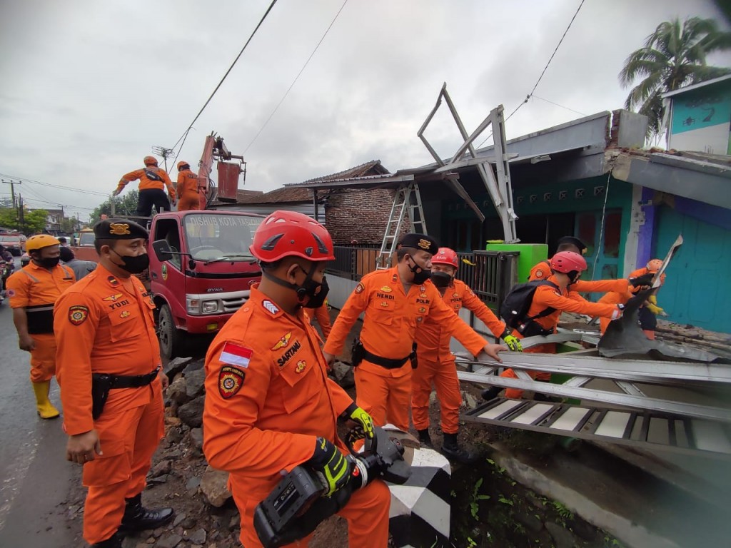 Tribuananews - Kota Tasikmalaya - Tim SAR Sat Samapta, TNI, Basarnas dan BPBD Kota Tasikmalaya bekerjasama membereskan besi, kayu dan puing rumah yang ambruk serta melokalisir lokasi rawan longsor susulan.
